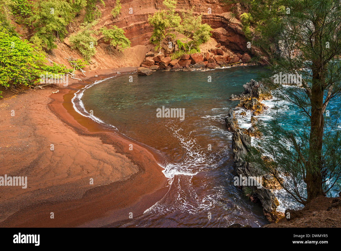 Red Sand Beach Maui . The striking crimson red sand, tinted by volcanic. Located in Hana, Maui the beach boasts beautiful and warm cobalt blue waters and tall rust-red hills whose contrast creates a mysterious and surreal scene.